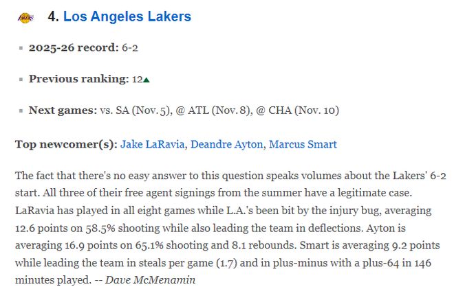 湖人借助一波4连胜狂飙,目前6胜2负西部第三,战力榜飙升12位来到第四。火箭同样是打出一波4连胜,战力榜飙升11位来到第五。